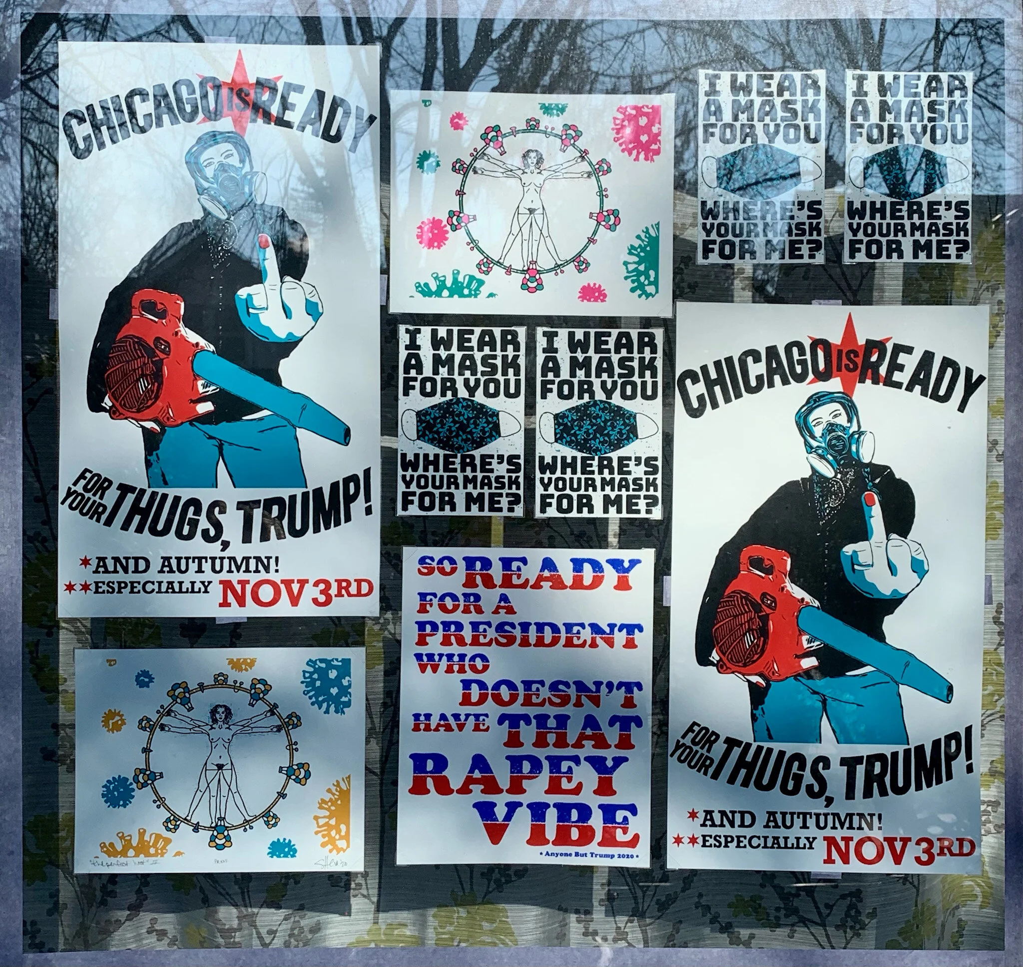 As I have been in full quarantine since March 13, 2020, my work has been a direct effort to battle isolation while maintaining a voice, distanced without silence, and redirect constricted energy and anger into positive influence. Most of these prints have been created to help raise funds for causes close to my heart: individuals impacted disproportionately be the pandemic, volunteer medics live-streaming BLM protests who need protective equipment replaced, and the Biden-Harris campaign.